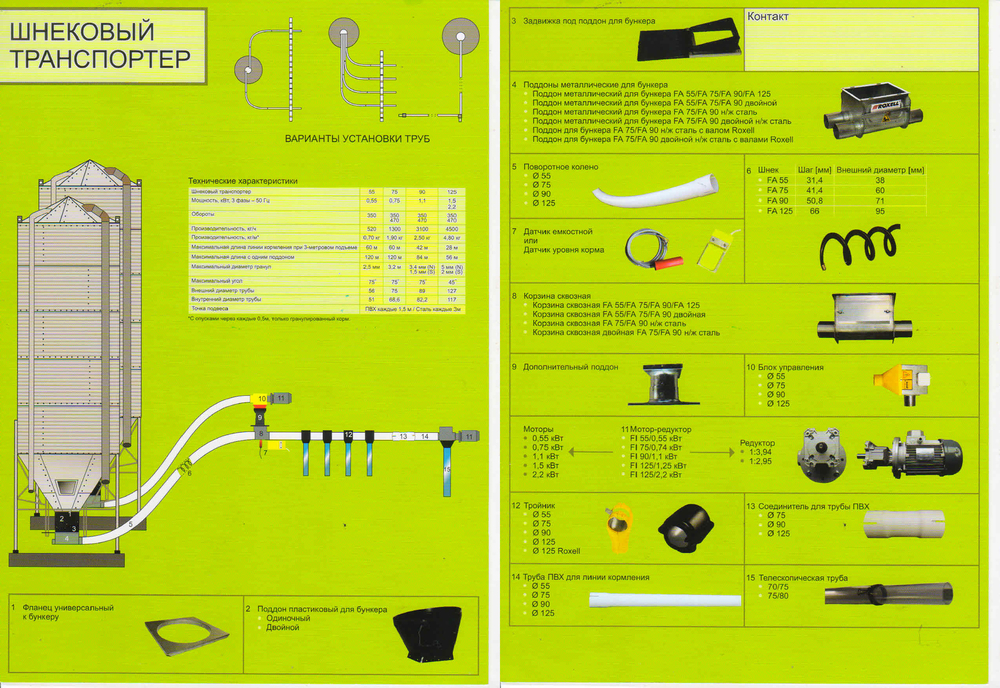У нас Ви можете придбати шнековий транспортер в комплекті, або окремі його елементи: бункер (силос), фланець універсальний до бункеру, піддон пластиковий для бункера, піддони металічні для бункера (різного виду), поворотне коліно, шнек, датчик рівня корму, блок управління, трійник, труби для транспортування корму та інші.
